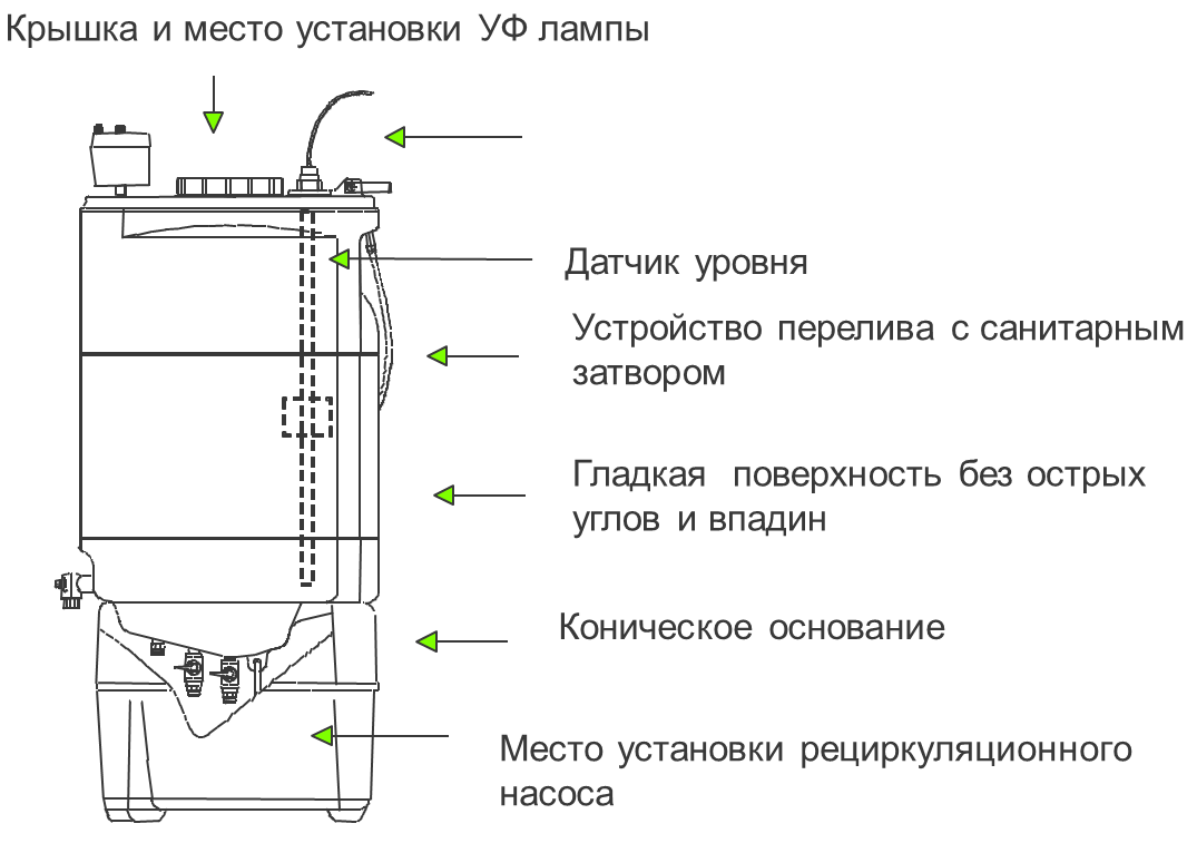 - Устройство аварийного перелива с санитарным затвором устраняет переполнение резервуара при отказе устройства управления в системе очистки воды.