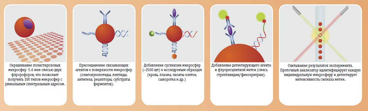 Измерение различных образцов с помощью проточных флуориметров построено на технологии xMAP. Каждая микросфера снаружи связана с флуоресцентными репортерами, взаимодействующими со специфическими аналитами. При считывании сигнала происходит возбуждение внутренних (связанных с микросферами) красителей, а также репортеров, связавшихся с конкретными аналитами. Полученные данные суммируются в виде профиля аналитов в зависимости от спектрального адреса микросферы и репортера.